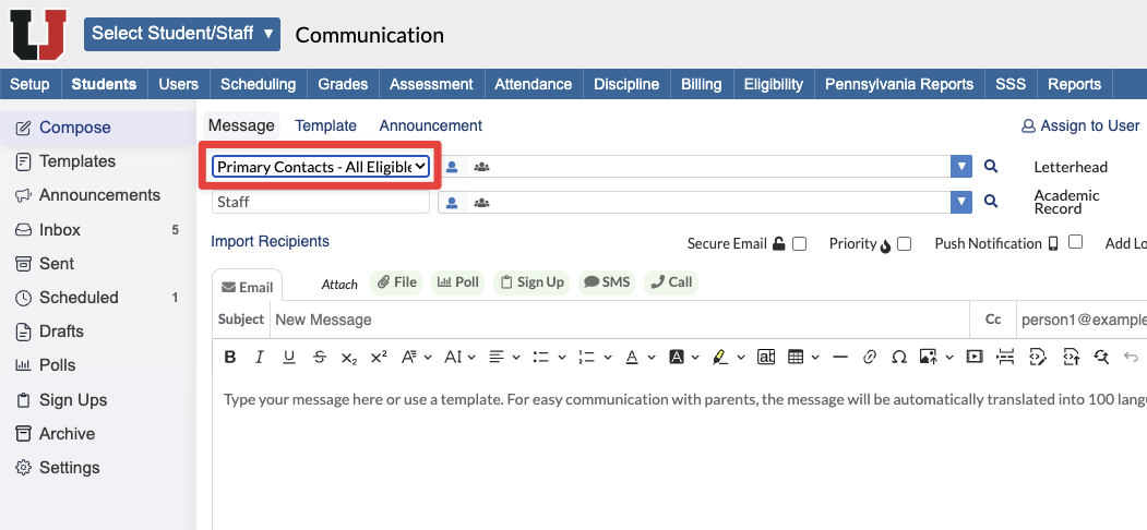 The Focus Communication module enables users to send email, phone calls and SMS for parents, students, and staff. Messages can be scheduled for future delivery or saved as drafts, and all incoming and outgoing messages are conveniently stored for easy review and reply management.