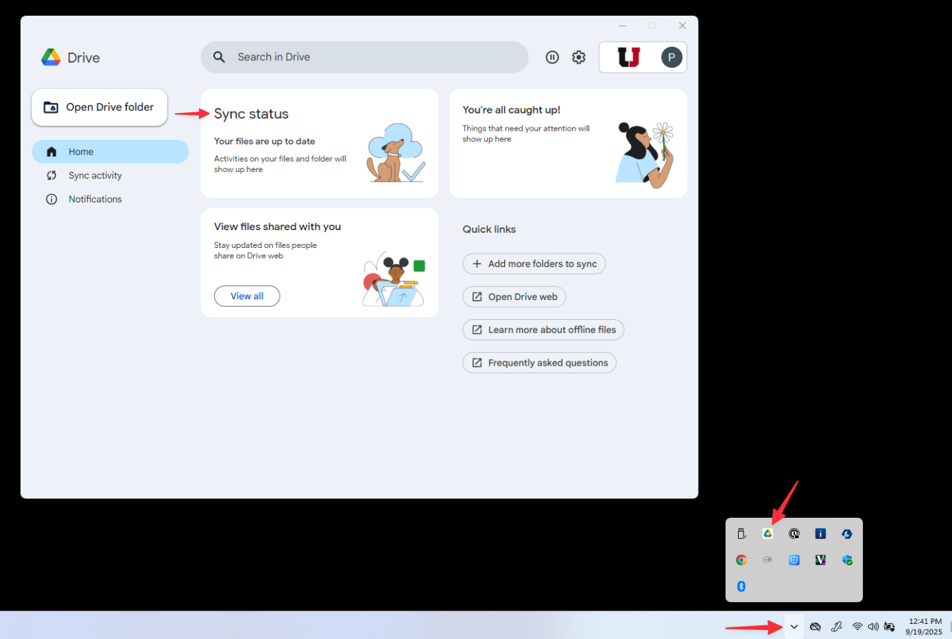 It is important to know what is happening 'behind the scenes' in this step. A file is being copied from the bus video management server to your computer, and then this file is being copied from your computer to a Google server. You can check on the file upload to Google by using the Google Drive icon in your taskbar, which is shown below. If a file is being synchronized to Google, the time until the upload is complete will be shown in the Sync status section. You must keep your computer powered on and connected to WiFi until the Sync status indicates that the file is uploaded to Google, which is shown as reading Your files are up to date.