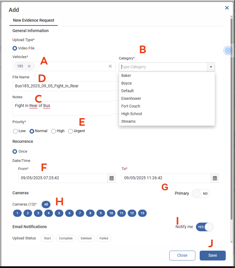 F. Enter the date and time for the requested video in the Date/Time From and To fields