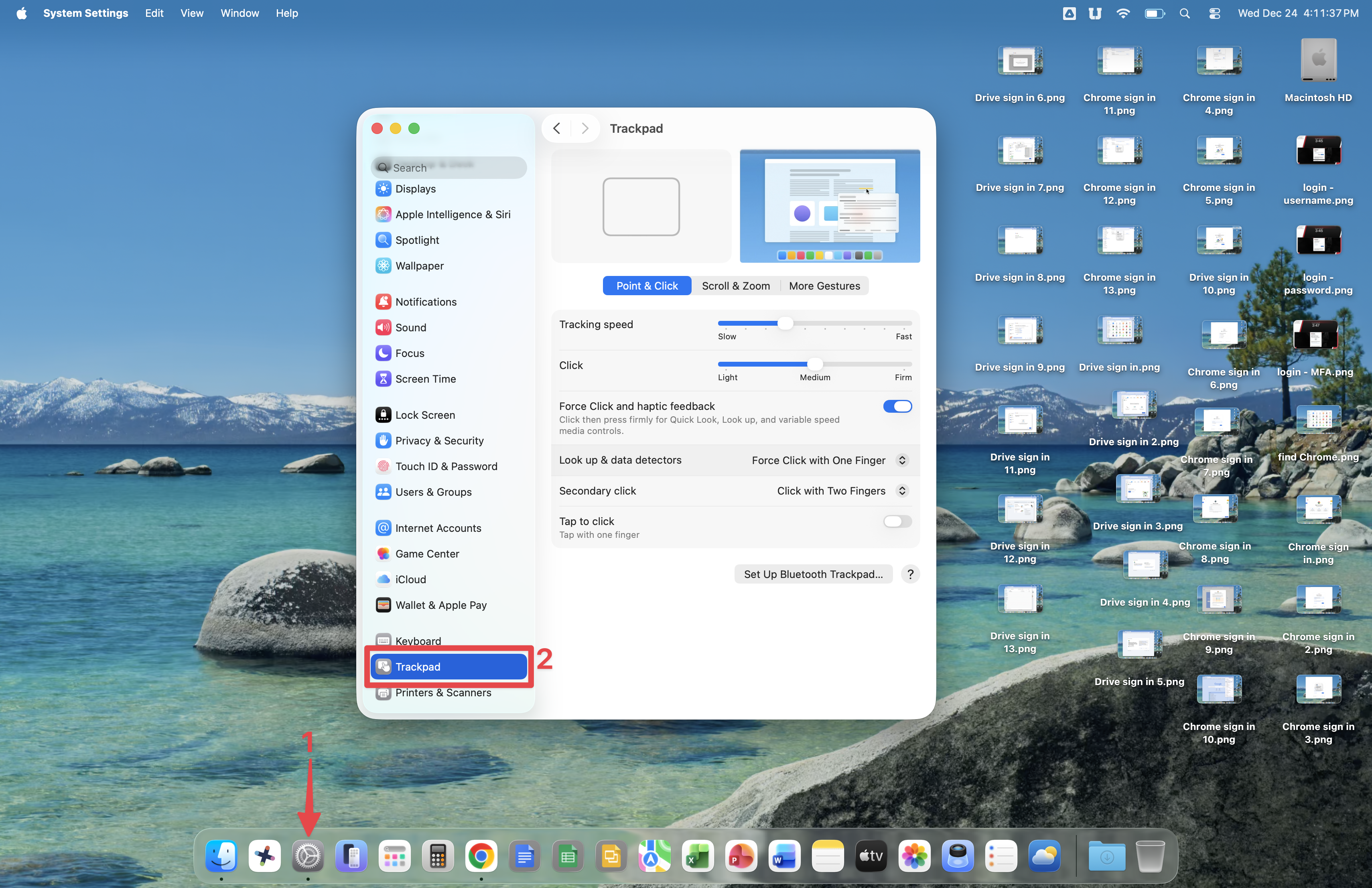 Once logged in, open the System Preference app and scroll down in the left pane until you see the Trackpad section. In this section, you can enable Tap to click, Secondary click (aka. right-click), and set your scrolling style.