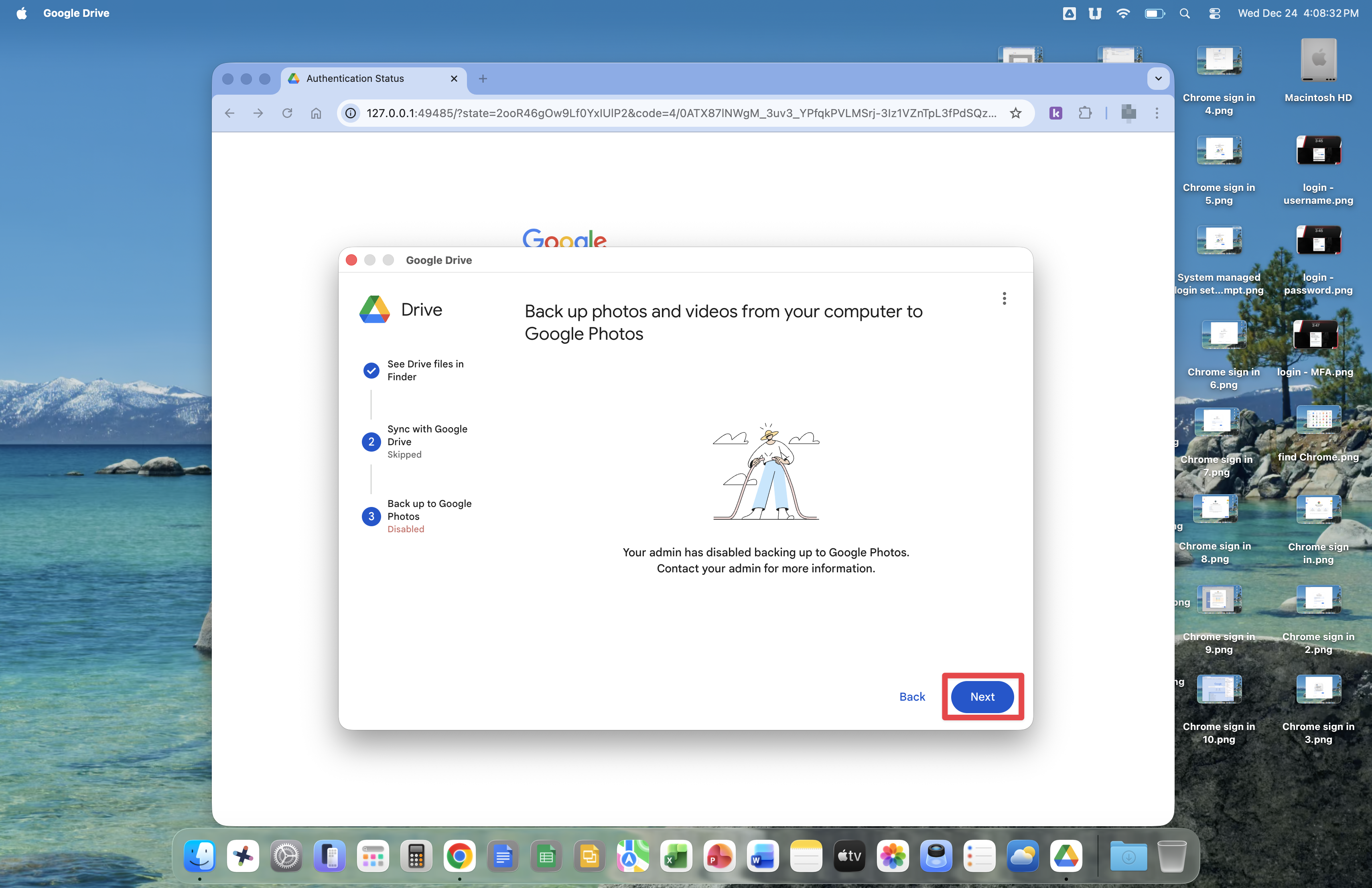 Click the Next button at the Back up photos and videos from your computer to Google Photos window. The Technology Department has disabled this feature.
