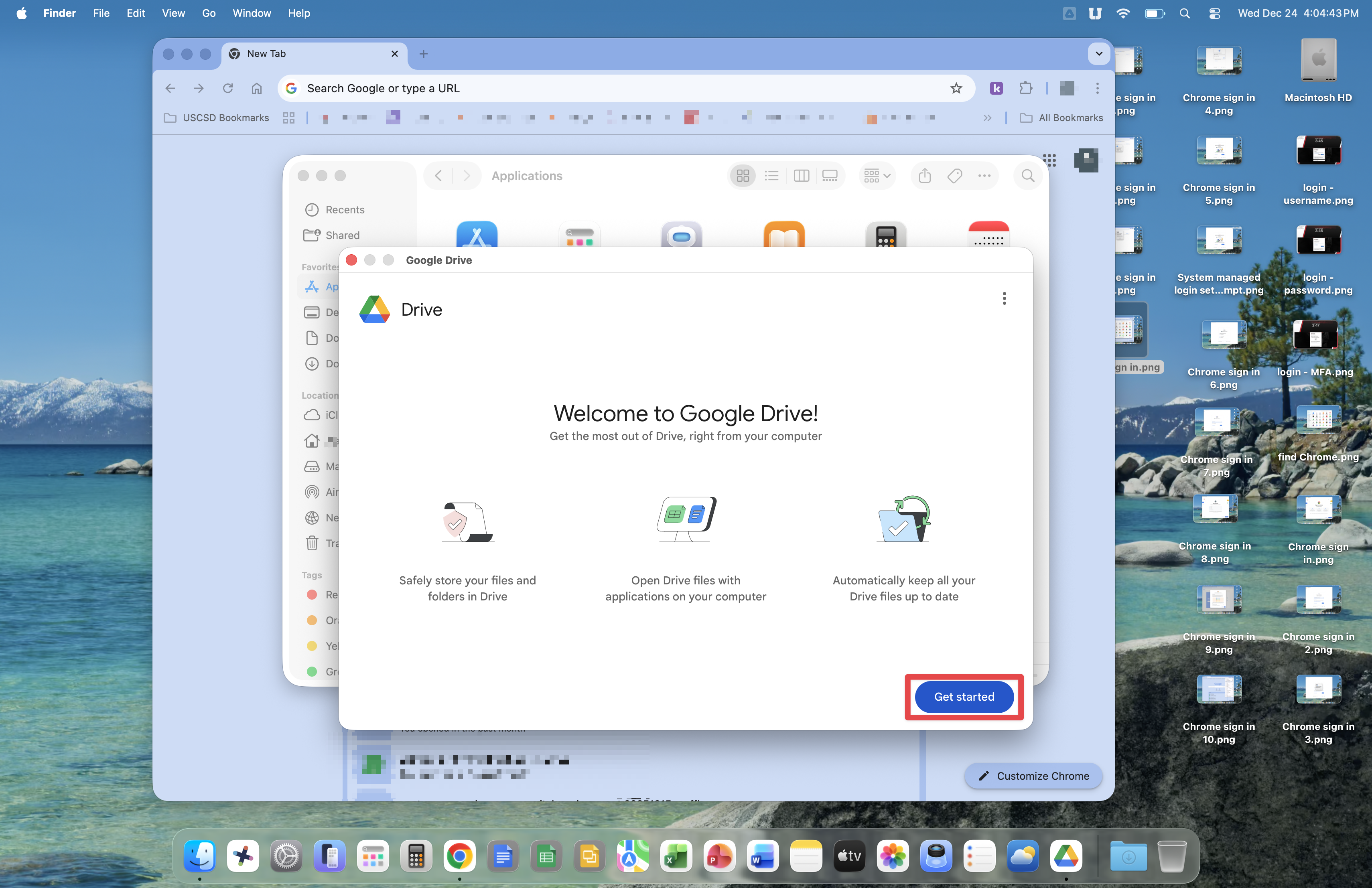 Google Drive is now set up. You can open Google Drive from the Applications section in Finder or the top menu bar at any time to see if files are syncing or other Google Drive related activities are in progress.