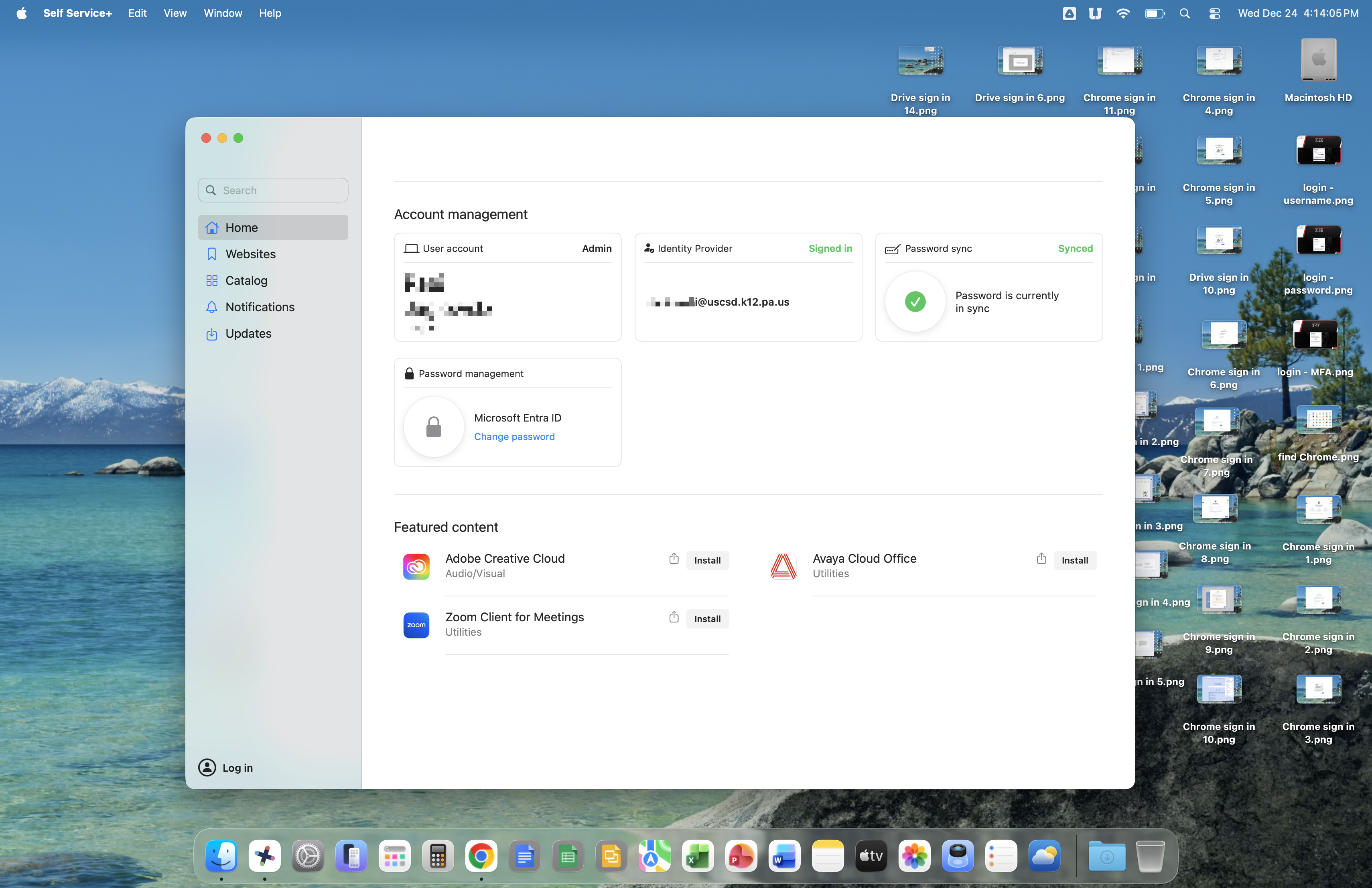 Once open, Self Service+ will show some detail about your SSO account and allow for SSO account password management. You will also see the Catalog section, which is where you will find printers and software for installing onto your Mac.