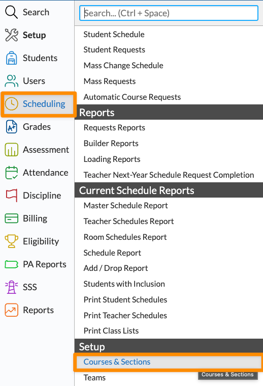 1. To verify your trigger courses in Focus, go to the Scheduling menu, then click on the Setup submenu and choose Courses & Sections.