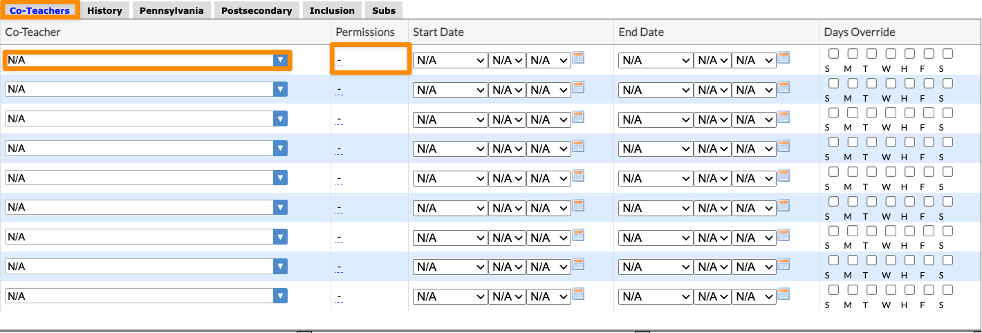4. Next, you will want to examine the Sections of the Course to ensure that any and all co-teachers have been assigned. If co-teachers need to be added, Read-only permissions are strongly recommended. Start and end dates and the Days Override do not need to be completed unless that co-teacher should only be assigned to part of a school year. Click Save when finished.