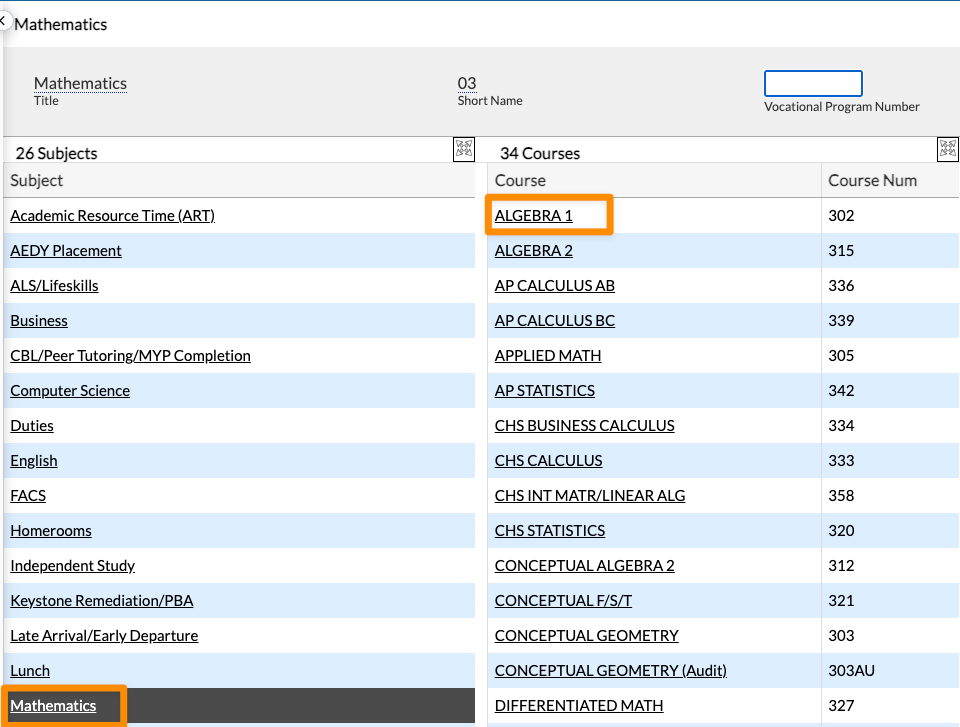 2. From the Courses & Sections screen, select the proper Subject from the left hand column, then click on the Course.