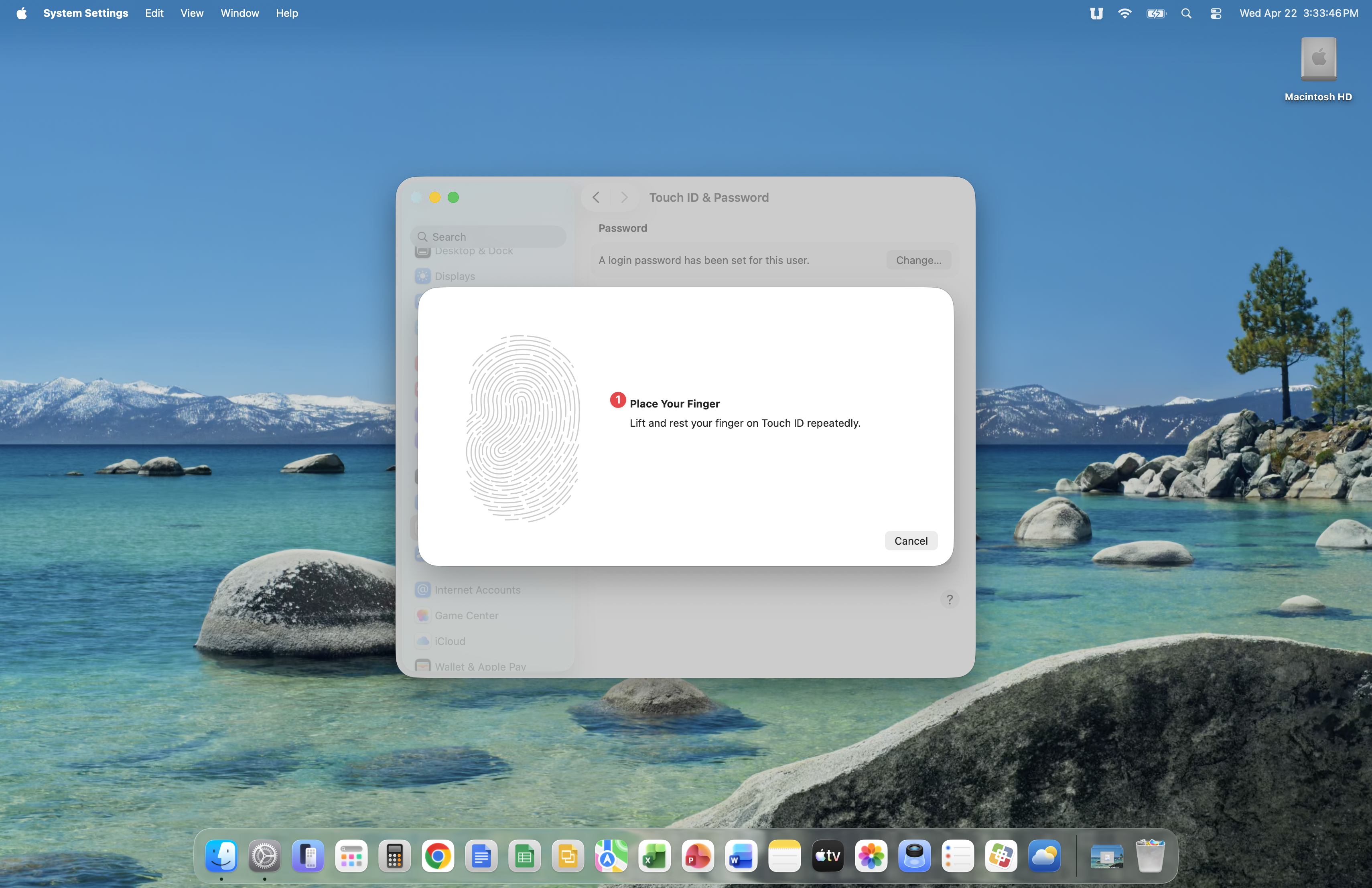 You will now add your fingerprint to your Mac by placing your finger on the fingerprint reader. Follow the direction below Place Your Finger during this process. You will notice that you are asked to raise and lower your finger onto the reader multiple times while your Mac records your fingerprint.
