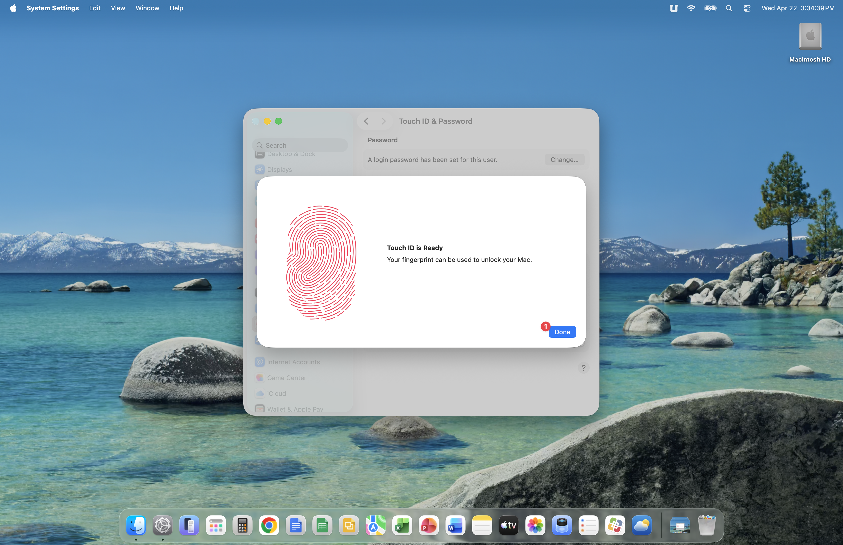 If you see Finger 1, your fingerprint is ready to use on your Mac. Ensure that Use Touch ID to unlock your Mac is enabled. You can leave the other settings on this screen as-is. Close the System Settings app at this point because you have completed fingerprint setup on your Mac.