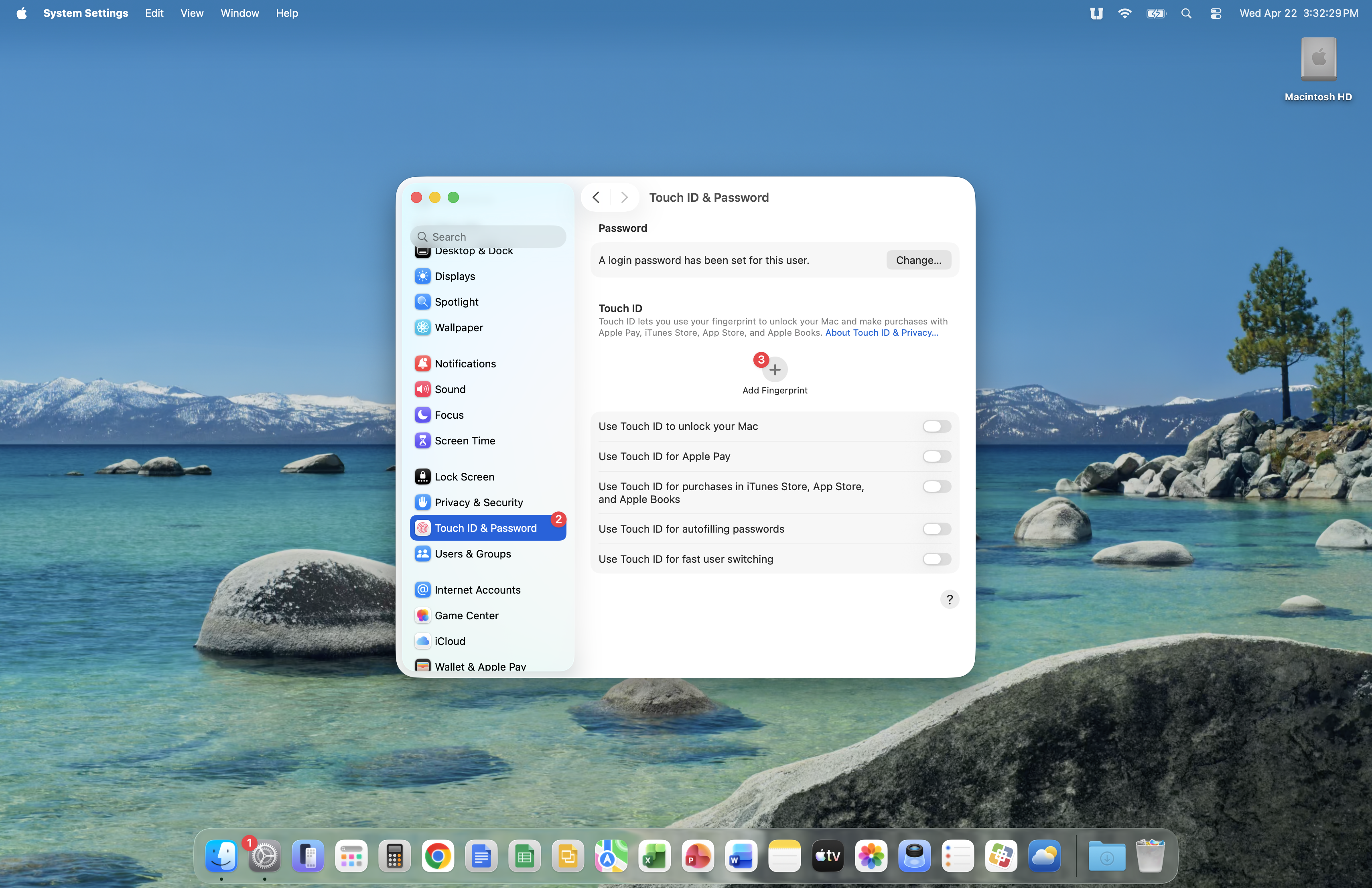 Open System Settings from your Dock. Scroll down the side panel and click Touch ID & Password, then click the + above Add Fingerprint.