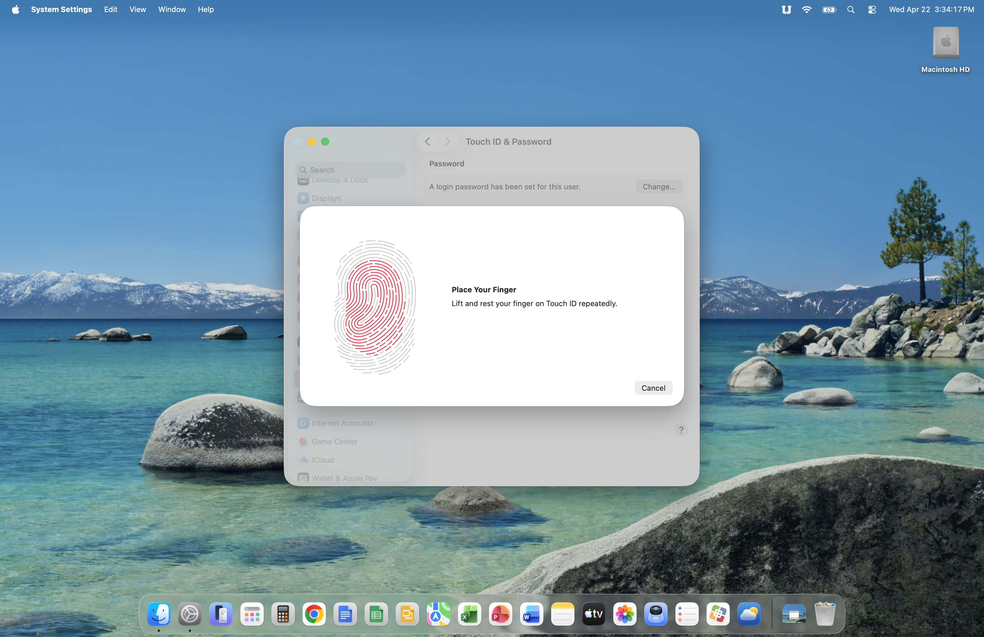 As you lower your finger onto the fingerprint reader, be careful not to press the button down because doing so will lock your Mac and you'll have to start the process over again.