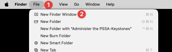 - Click on File [1] on the top left hand corner of your screen, then New Finder Window [2].