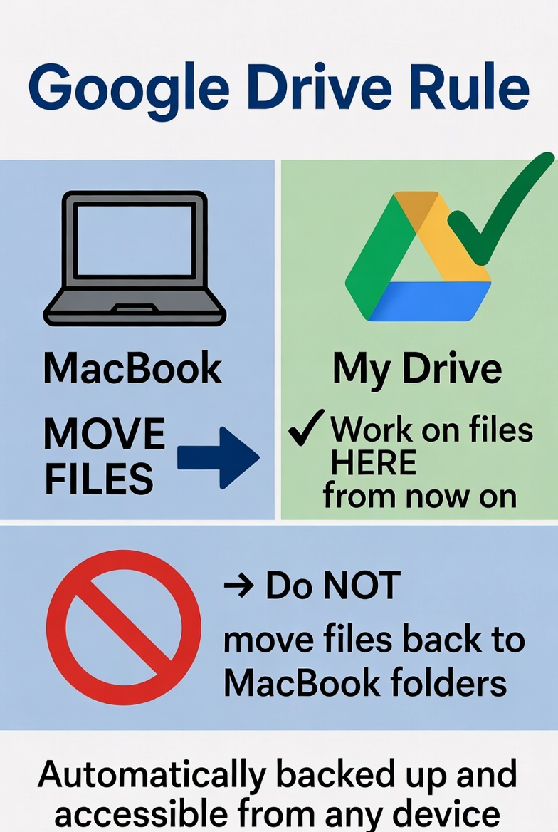 Important: Once files are moved into My Drive (Google Drive), access and work with them from that location. Do not move them back to your MacBook folders. Files stored in Google Drive are automatically backed up and can be accessed from any device when you sign in.