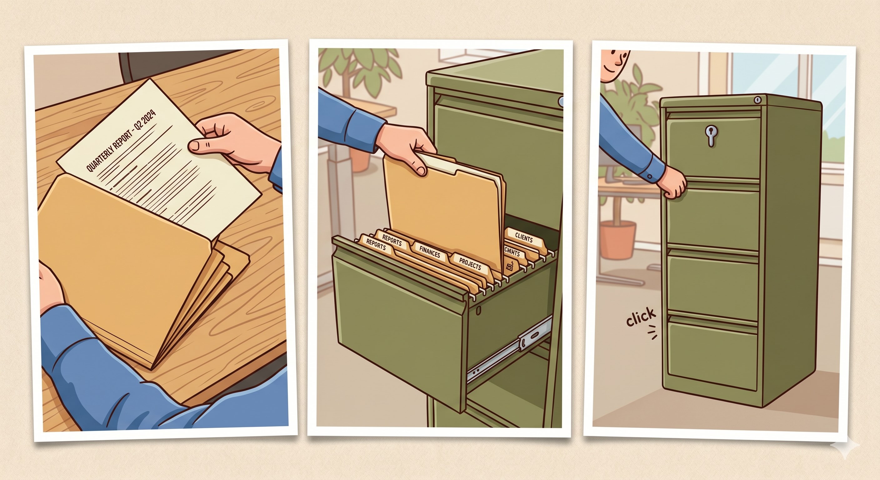 Using folders keeps your files organized, easy to find, and easier to manage. Just like you would not place loose papers into a file cabinet, your digital files should be placed into clearly named folders.