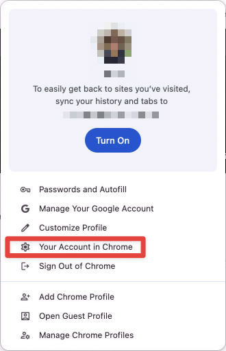 3. After you sign in, instead of "Turn on sync", you will see the following. Instead of clicking "Turn On", click "Your Account in Chrome" below it.