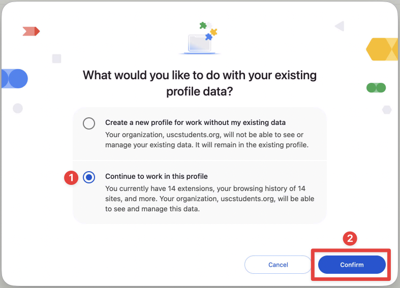 4. You will then be asked "What would you like to do with your existing profile data?" Select "Continue to work in this profile". This will allow you to bring in existing data. Click "Confirm".