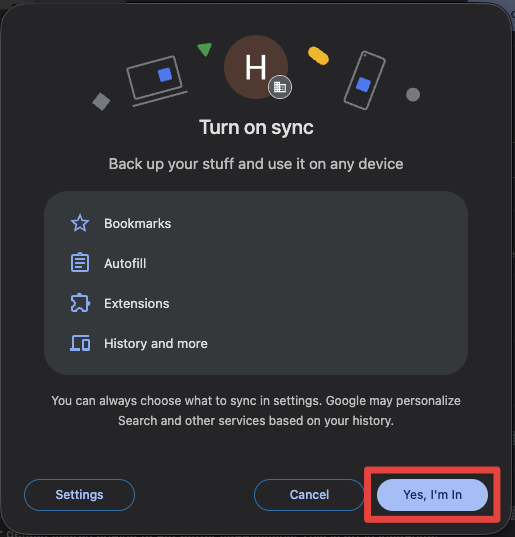 4. Once authenticated with your USCSD SSO credentials, you will be asked if you want to "Turn on sync". Select "Yes, I'm in".