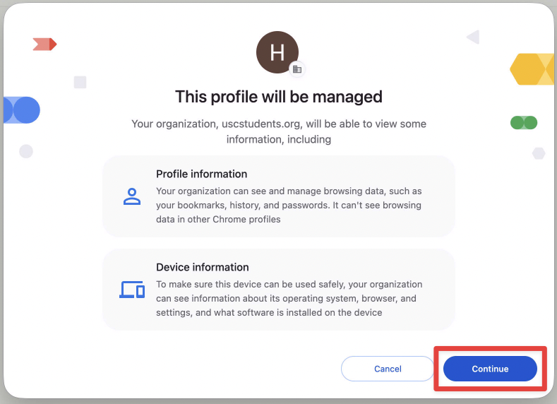 3. You will be presented with a "This profile will be managed" window. Click "Continue".