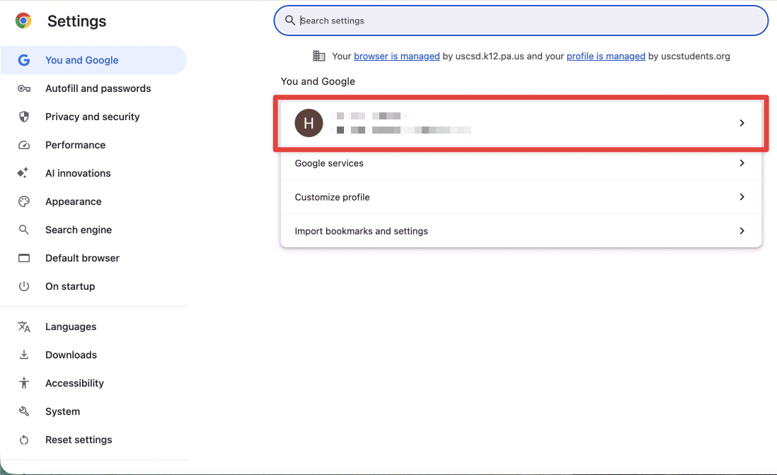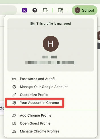 6. Now, if you look in the top right corner, you should see your icon with either a "School" or "Work" label next to it. If you click on it to open the menu, you will not see a "Sync is on" button. Instead, click on "Your Account in Chrome".