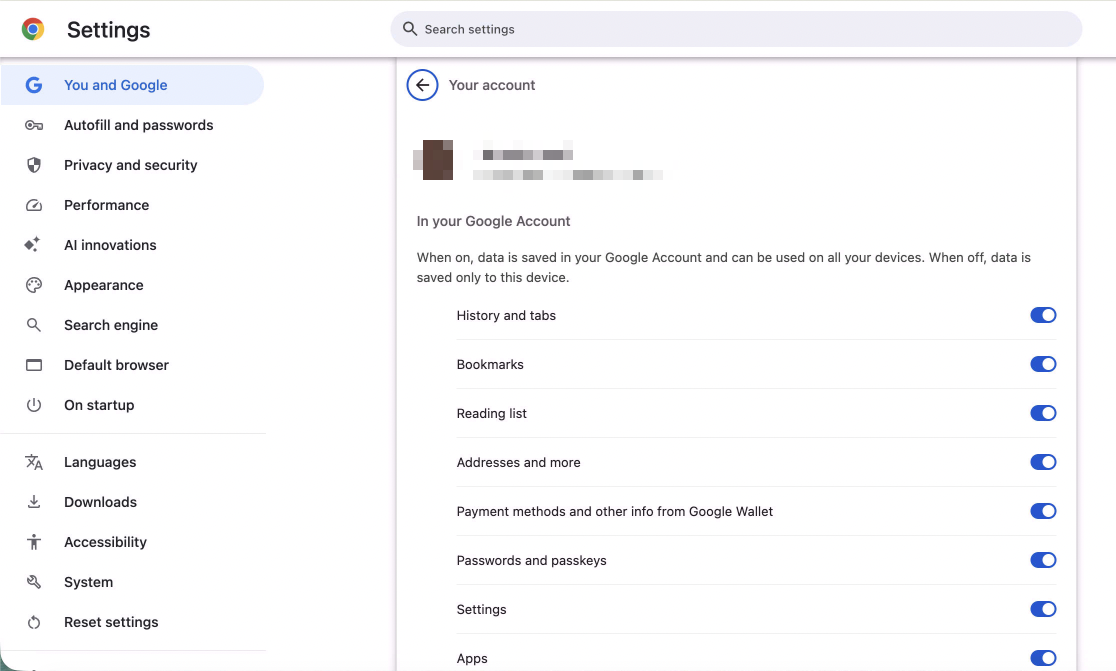 6. To verify that everything is set to sync, click on "Sync is on", and a Settings tab will open. Select "You and Google" from the left if it isn't already, then "Manage what you sync" under the "Sync" heading.