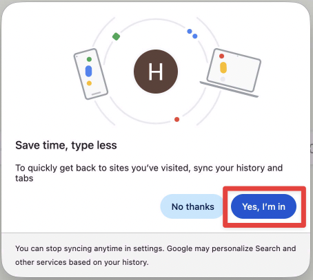 5. Next, you will see a "Save time, type less" window. (This replaces the "Turn on sync" window from Method 1.) Click "Yes, I'm in".